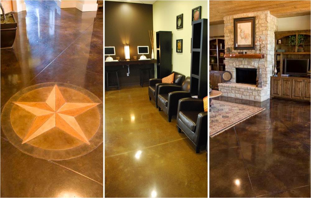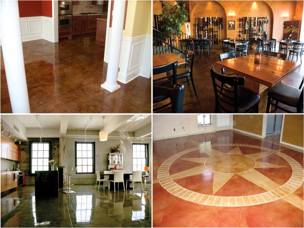 Поскольку бетон не является однородным, рисунок в результате химического окрашивания получается также неоднородным, разнообразным, неповторимым и уникальным. Таким методом в основном окрашиваются полы, которые часто декорируют рустами, имитируя стыки плит. После такой обработки поверхность практически неотличима от пола из натурального камня. При декорировании бетонных полов успешно применяются различные трафареты, при помощи которых наносятся разнообразные рисунки, логотипы и надписи.