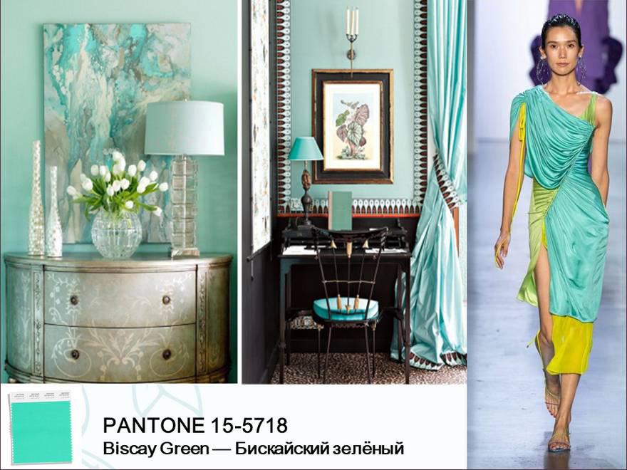 Аквамарин ассоциируется с очищающей водой, поэтому PANTONE 15-5718 Biscay Green — Бискайский зелёный призван охлаждать и освежать обстановку.