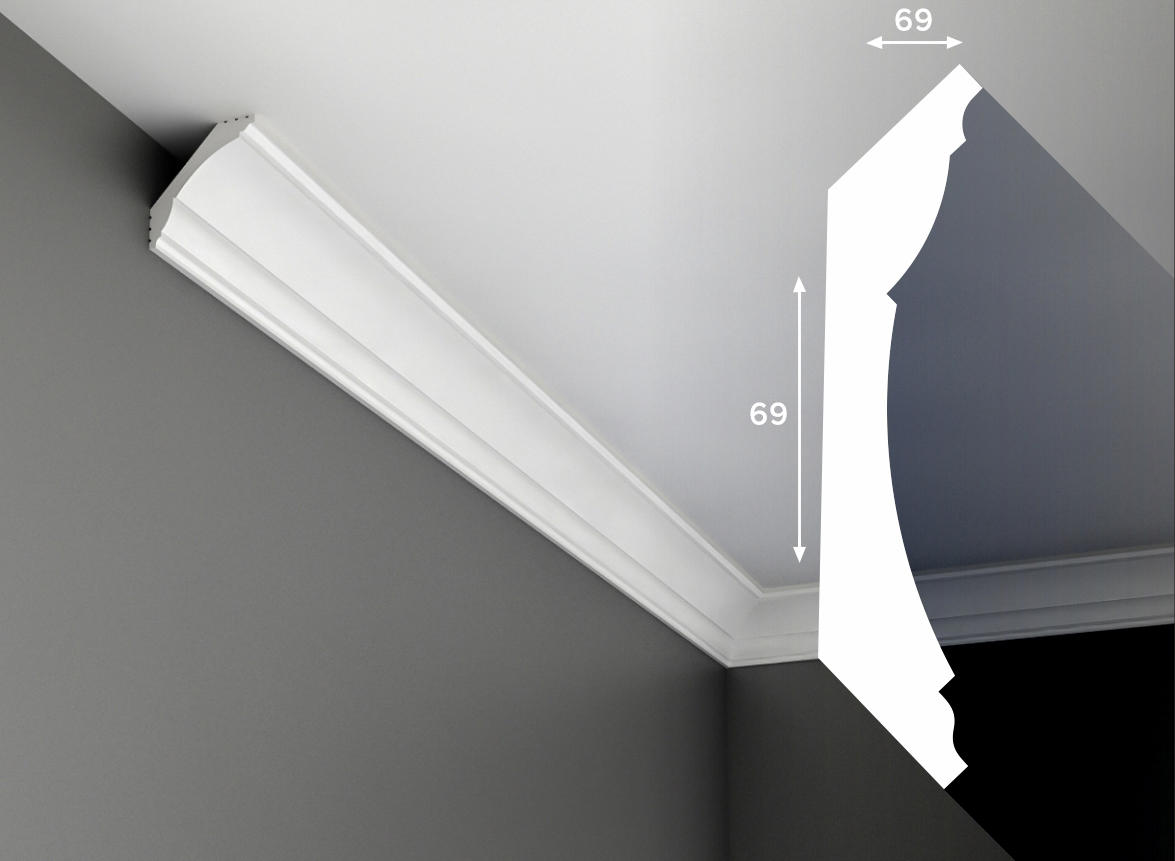 •Практическая. Изделия из экополимера легко скрывают изъяны, дефекты геометрии помещения и стыков потолка и стен. При этом благодаря особенностям материала экополимерный карниз не дает усадку и не теряет форму со временем.