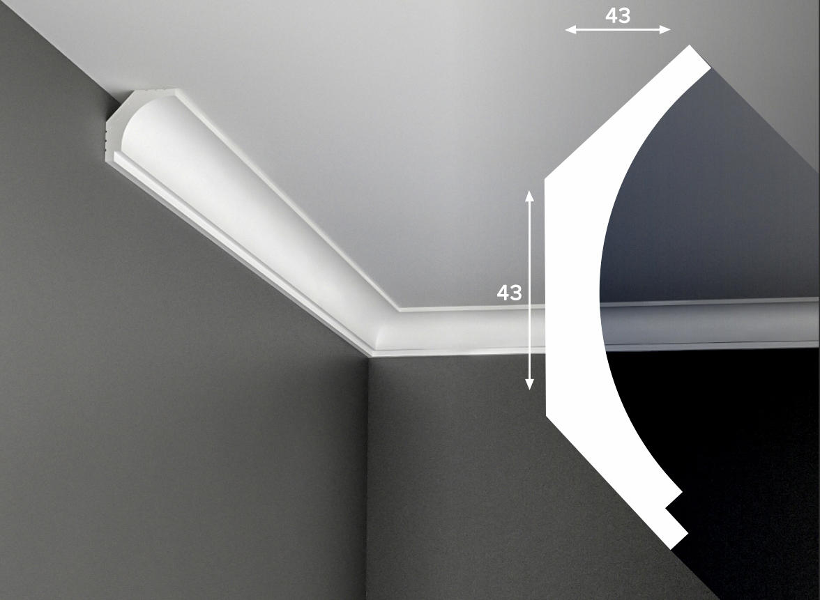 •Практическая. Изделия из экополимера легко скрывают изъяны, дефекты геометрии помещения и стыков потолка и стен. При этом благодаря особенностям материала экополимерный карниз не дает усадку и не теряет форму со временем.