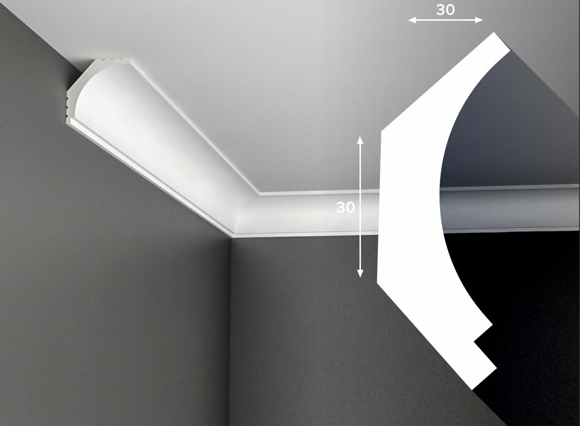 •Практическая. Изделия из экополимера легко скрывают изъяны, дефекты геометрии помещения и стыков потолка и стен. При этом благодаря особенностям материала экополимерный карниз не дает усадку и не теряет форму со временем.