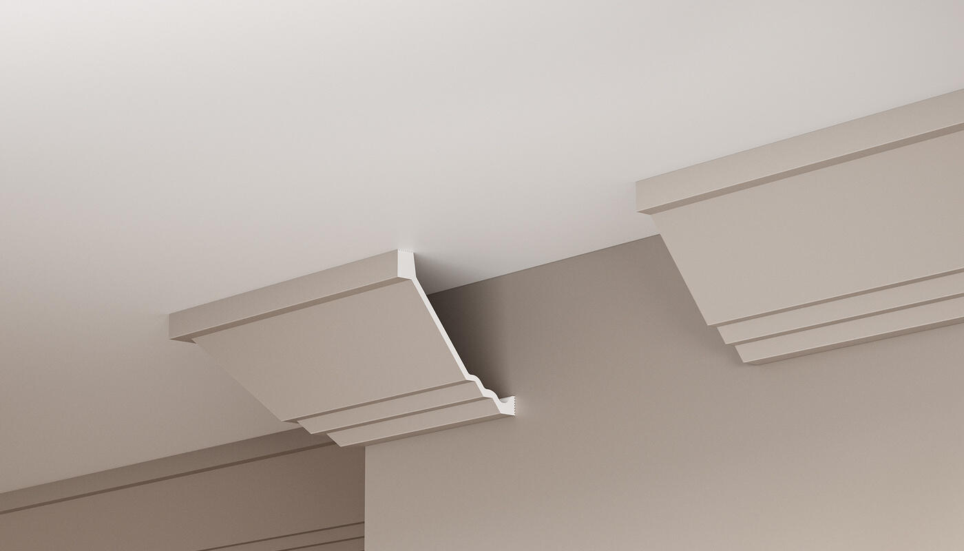 •Практическая. Изделия из экополимера легко скрывают изъяны, дефекты геометрии помещения и стыков потолка и стен. При этом благодаря особенностям материала экополимерный карниз не дает усадку и не теряет форму со временем.