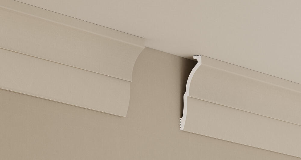 •Практическая. Изделия из экополимера легко скрывают изъяны, дефекты геометрии помещения и стыков потолка и стен. При этом благодаря особенностям материала экополимерный карниз не дает усадку и не теряет форму со временем.