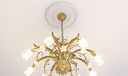 Потолочная розетка в сочетании с карнизами, плинтусами, молдингами позволит создать изысканный и законченный вид интерьера.