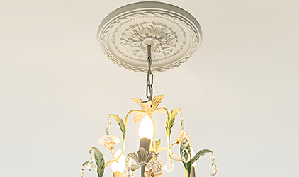 Потолочная розетка в сочетании с карнизами, плинтусами, молдингами позволит создать изысканный и законченный вид интерьера.