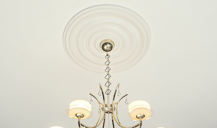 Потолочная розетка в сочетании с карнизами, плинтусами, молдингами позволит создать изысканный и законченный вид интерьера.