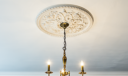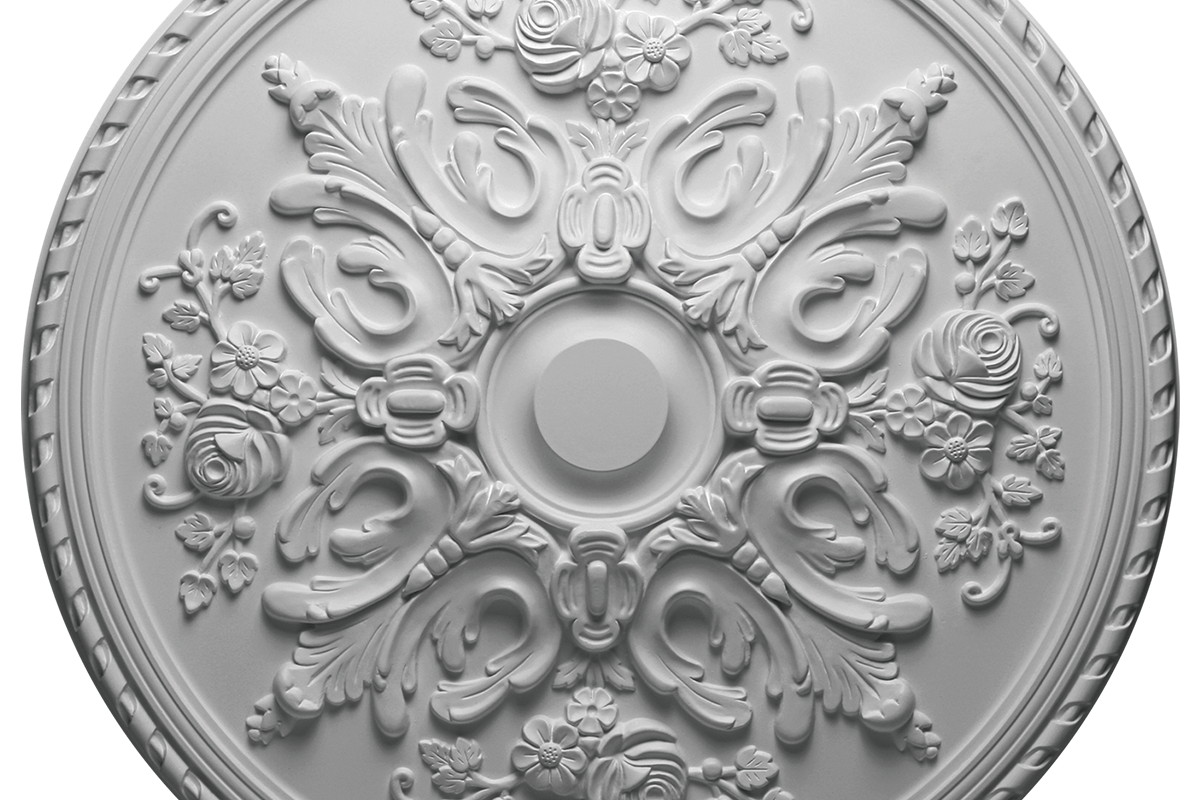 Потолочная розетка в сочетании с карнизами, плинтусами, молдингами позволит создать изысканный и законченный вид интерьера.