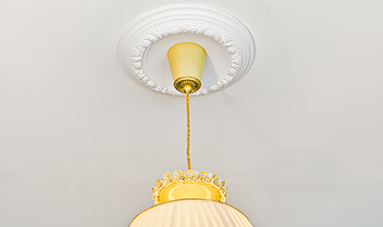 Потолочная розетка в сочетании с карнизами, плинтусами, молдингами позволит создать изысканный и законченный вид интерьера.