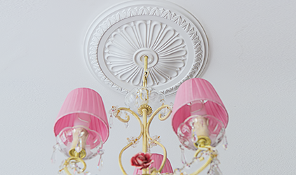 Потолочная розетка в сочетании с карнизами, плинтусами, молдингами позволит создать изысканный и законченный вид интерьера.