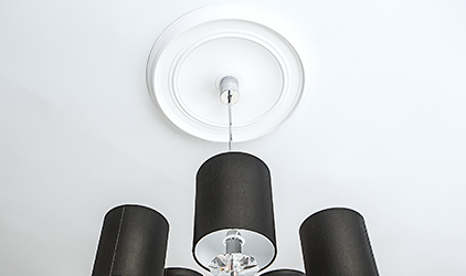 Потолочная розетка в сочетании с карнизами, плинтусами, молдингами позволит создать изысканный и законченный вид интерьера.