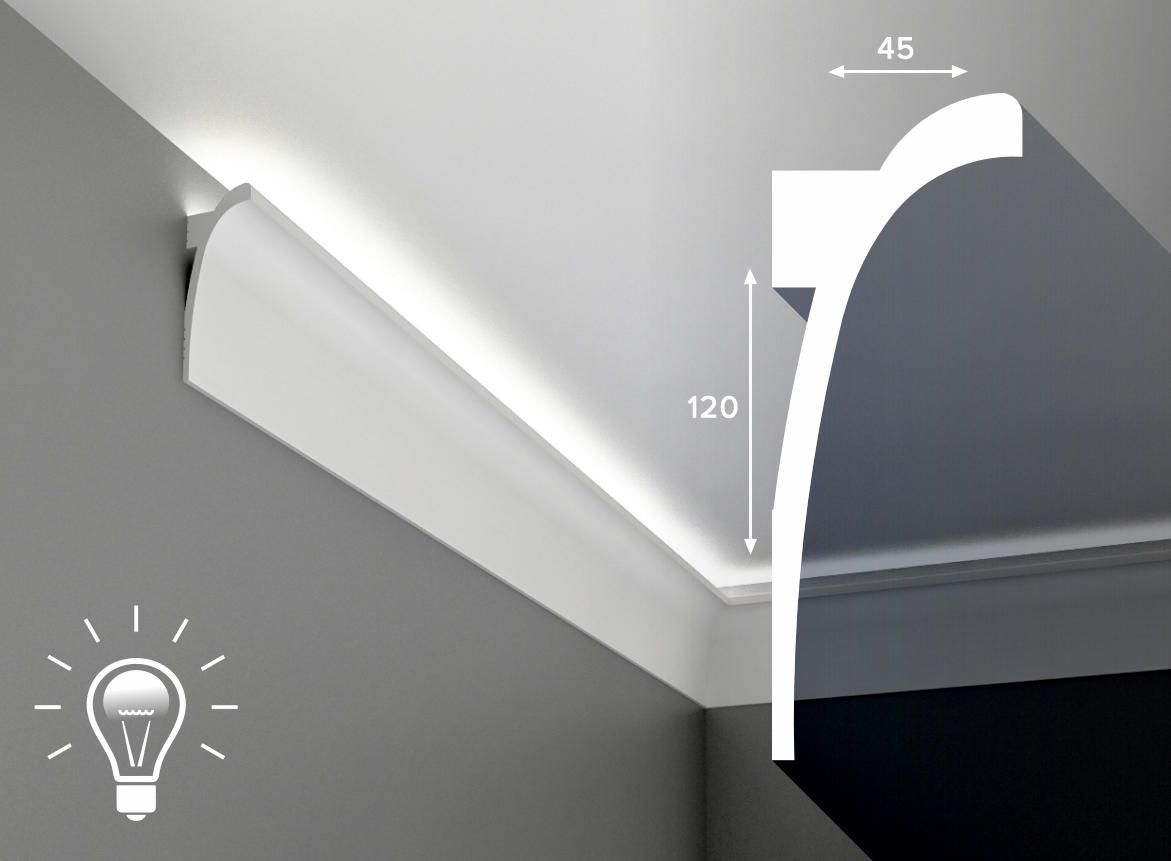 •Практическая. Изделия из экополимера легко скрывают изъяны, дефекты геометрии помещения и стыков потолка и стен. При этом благодаря особенностям материала экополимерный карниз не дает усадку и не теряет форму со временем.