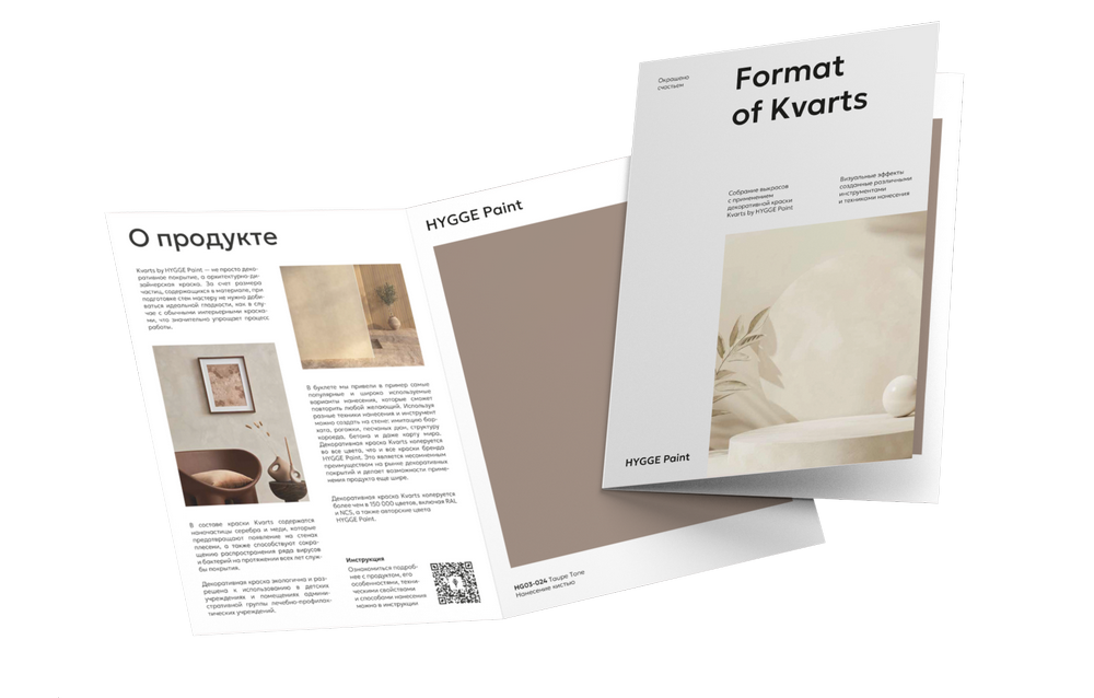 Лифлет A4 по декоративной краске Kvarts от HYGGE Paint с текстурой песка. Содержит образцы нанесения в разных техниках: краскопульт, валик и кисть.