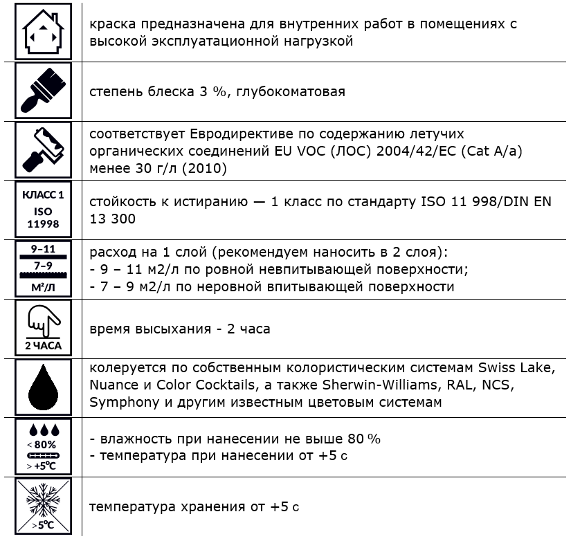 Swiss Lake Intense Resistance Plus — глубокоматовая краска с повышенной износостойкостью. Она обеспечит поверхности механическую прочность и предотвратит образование затертостей.