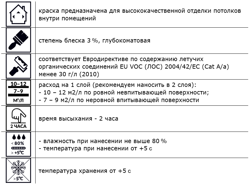 Рекомендуется использовать для окраски потолков в сухих помещениях на оштукатуренные, бетонные, кирпичные, полиуретановые, зашпатлеванные поверхности и гипсокартон.