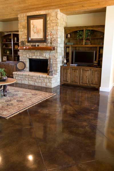Поскольку бетон не является однородным, поэтому рисунок в результате химического окрашивания получается также неоднородным, разнообразным, неповторимым и уникальным. Готовые полы часто декорируют рустами, имитируя стыки плит. После такой обработки поверхность практически неотличима от полированного пола из натурального камня. При декорировании бетонных полов успешно применяются различные трафареты, при помощи которых наносятся разнообразные рисунки, логотипы и надписи.