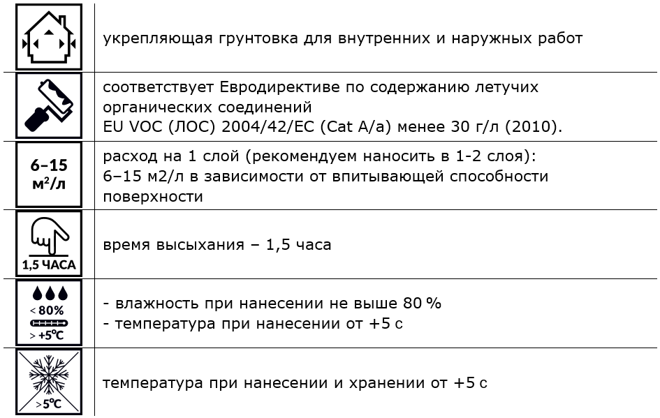Для внутренних работ грунтовка используется в разбавленном виде в соотношении 1:3 с водой (1 часть грунтовки на 3 части воды). Для грунтования поверхностей во влажных помещениях, по сильно мелящим поверхностях и для наружных работах необходимо использовать неразбавленную грунтовку.